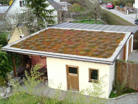 Die Garage wurde mit einer PVC Abdichtungsfolie versehen und anschliesend mit Bodendeckerpflanzen begrünt.Die Anschlußbleche  und die Dachrinne wurden in Kupfer ausgeführt.